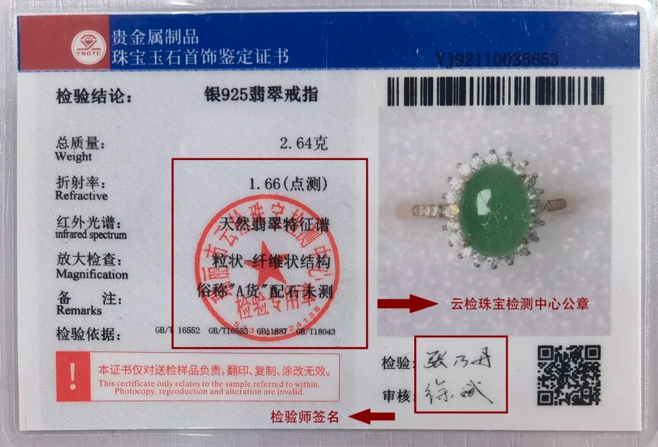 海星直播珠宝玉石首饰鉴定证书背面有单位公章和检验师签名