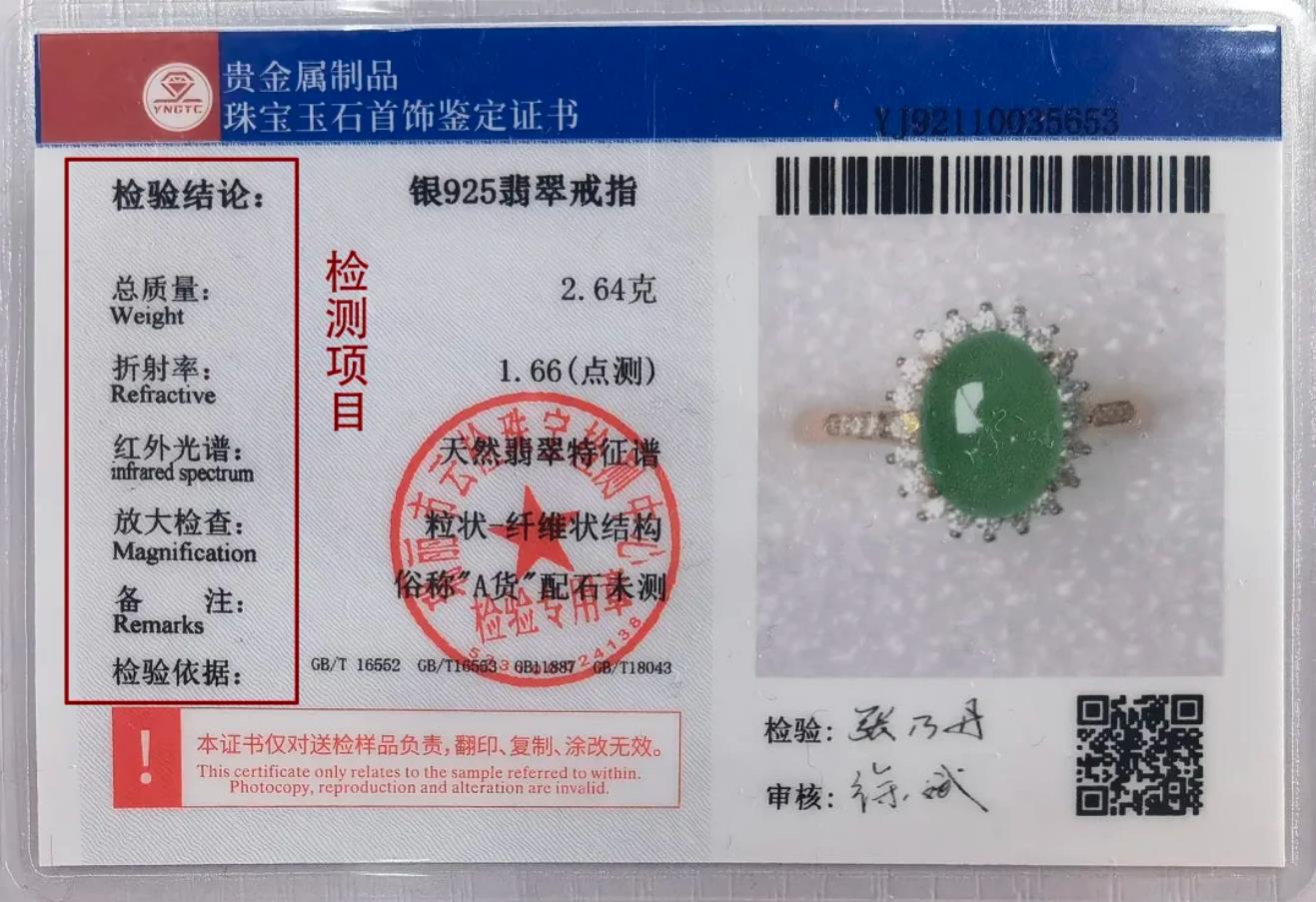 海星直播珠宝玉石首饰鉴定证书背面有“检测项目”